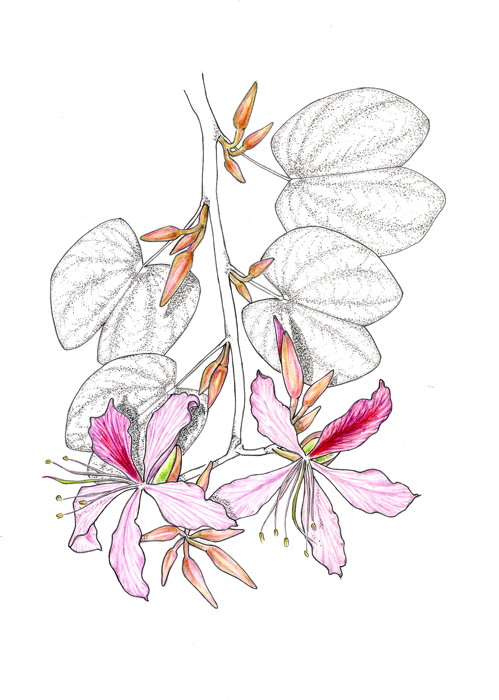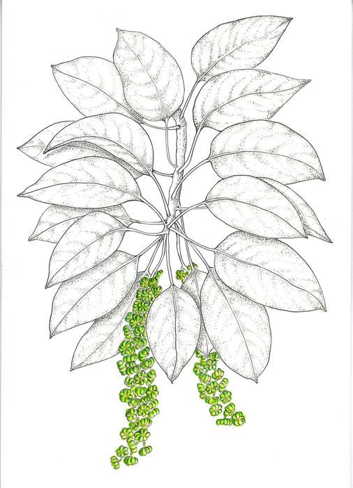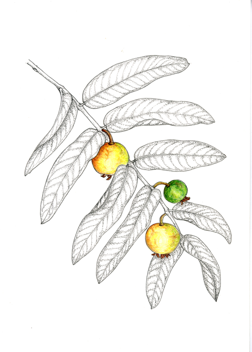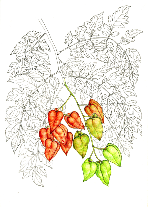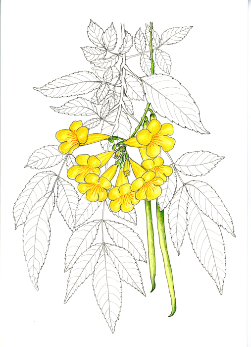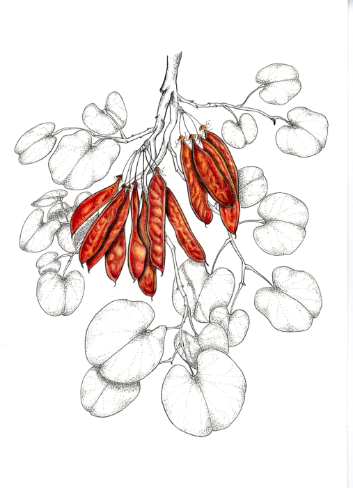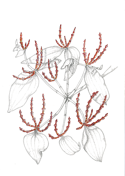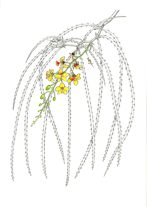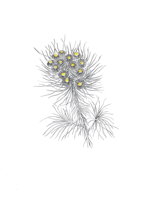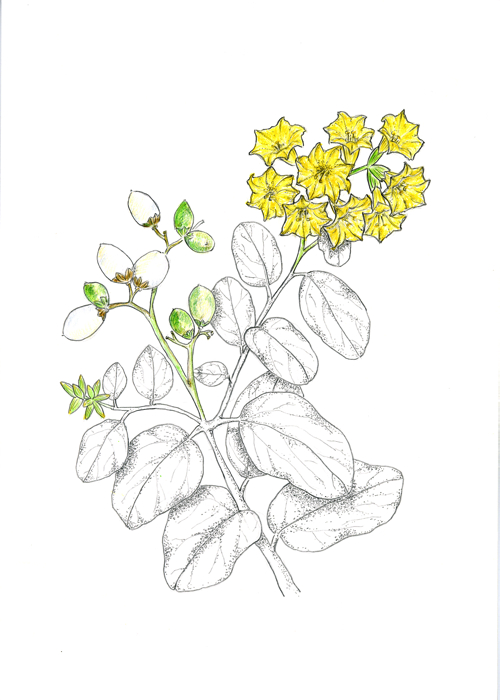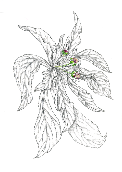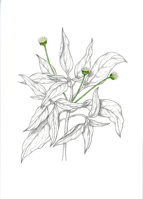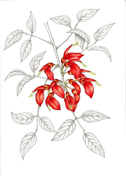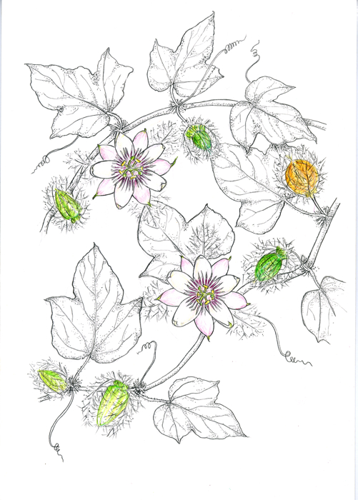 Láminas botánicas de especies endémicas, nativas e introducidas de la isla Floreana, la mas pequeña de las habitadas, del archipiélago de Galápagos en Ecuador. 30X21 cm., lápices acuarelables y grafito.